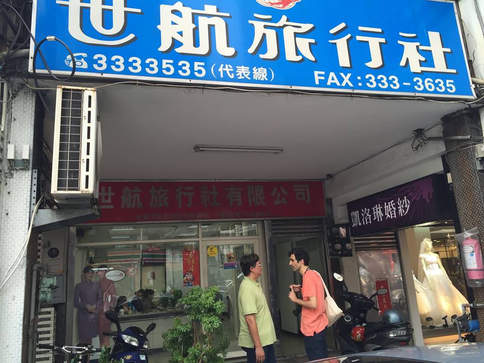 位於復興路上的「世航旅行社」窗明几淨,規模不大,卻讓人看起來很舒服,這裡是戲中男主角的辦公室。被問起怎麼會借給劇組拍攝,秦小姐笑著說,早在去年導演就隻身來到旅行社,老實說看著一個老外走進來,既不坐下來,又左顧右盼地,實在讓人懷疑他的目的。所以即使尚若白導演自我介紹了半天,還是不免被列入詐騙犯的行列。